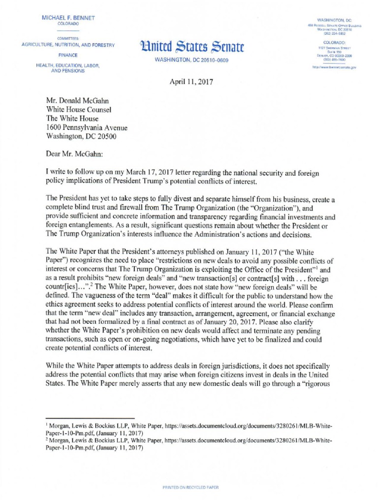 Bennet Continues to Press President on Foreign Conflicts of Interest