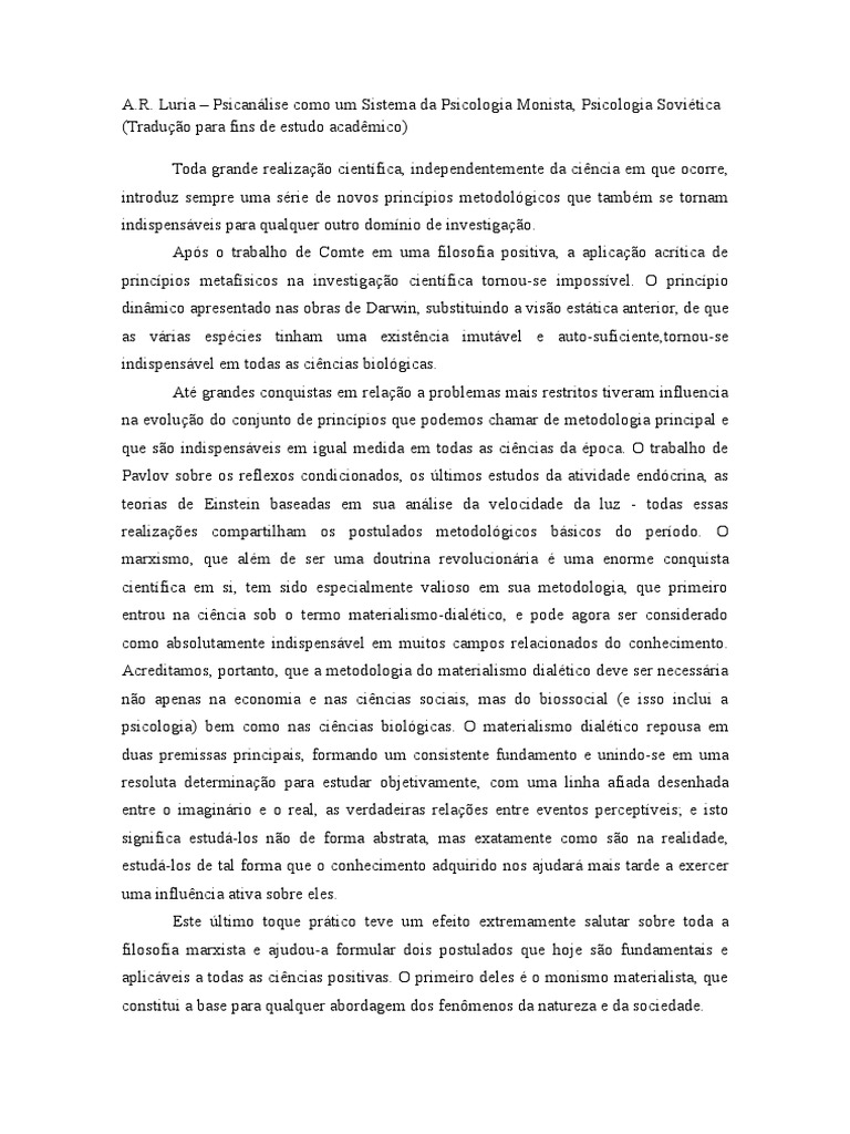 Luria Psicanlise como um Sistema da Psicologia Monista, Psicologia Sovitica