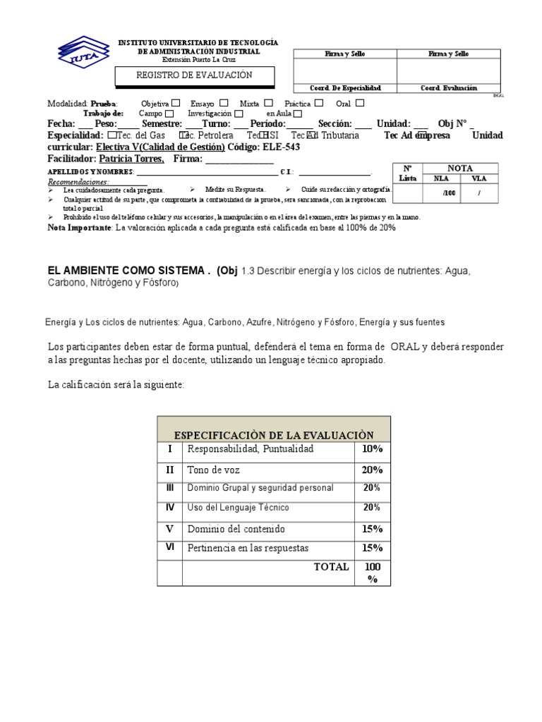 Fecha: ___ Peso: __ Semestre: Turno: Perodo: ____ Seccin: Unidad: ___ Obj N
