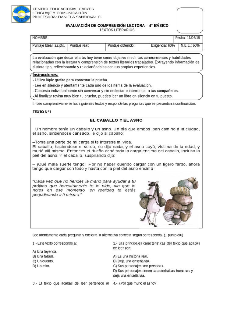 EVALUACIN DE COMPRENSIN LECTORA 4 BSICO