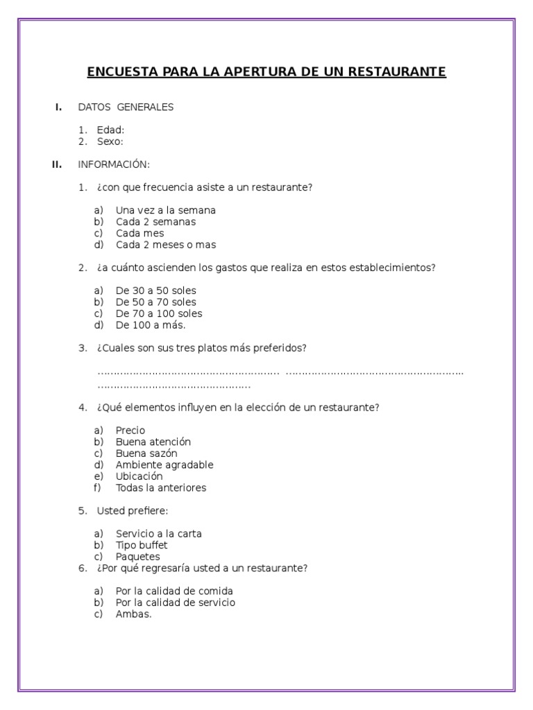 ENCUESTA PARA LA APERTURA DE UN RESTAURANTE