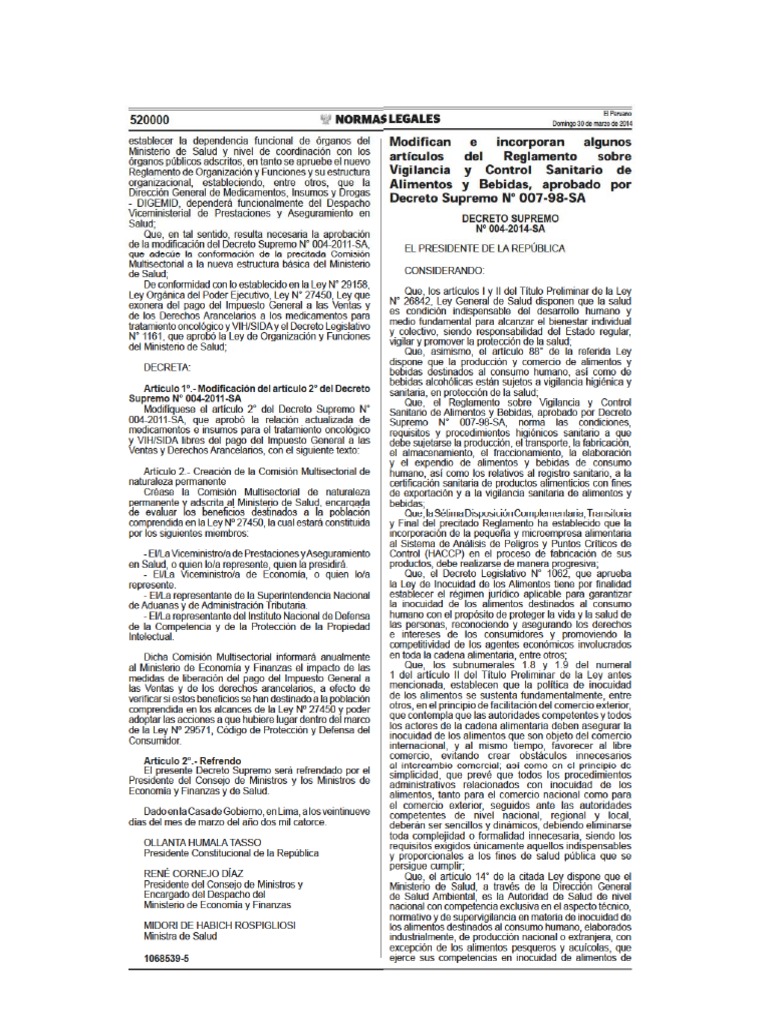 de Alimentos y Bebidas aprobado por Decreto Supremo N 007-98-SA.