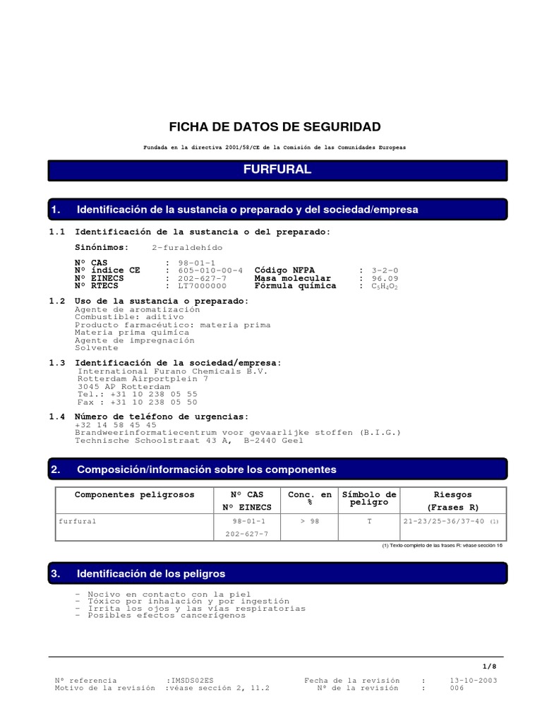 DESIGNACIN DE LA MERCANCA : UN 1199, Furaldehdos