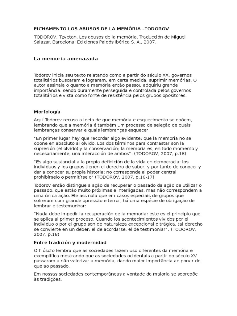 Todorov trata aqui dos usos da memria, comeando a observar a questo