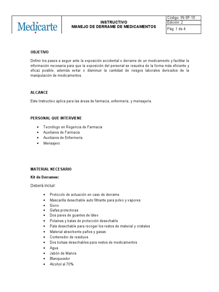 Definir los pasos a seguir ante la exposicin accidental o derrame de un medicamento y facilitar la