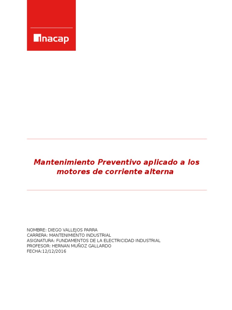 32- 33- 34- 35- 36- 37- .25- 26- 27- 28. cadena. Comprobar estado de rodamientos del motor 5. Comprobar si se rosan. cuando los motores están en marcha lo principal es darle una: 31- 1. olor a quemado y vibraciones 4. poleas sobre la protección 7. Limpieza exterior 2. bandas o corres. Comprobar influencias de los agentes exteriores tales como el polvo. Comprobar la buena ventilación y calentamientos anormales 3. aceite. Observar ruidos anormales. Comprobar cargas en los aparatos de media 6. ácidos o gases. Mantenimiento preventivo aplicado a los motores de corriente alterna trifásicos: 29- 30. Bueno en el mantenimiento preventivo en los motores de corriente alterna. agua.