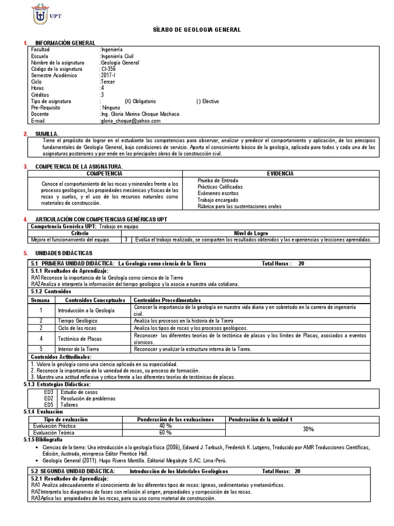 fundamentales de Geologa General, bajo condiciones de servicio. Aporta el conocimiento bsico de la geologa, aplicada para todas y cada una de las