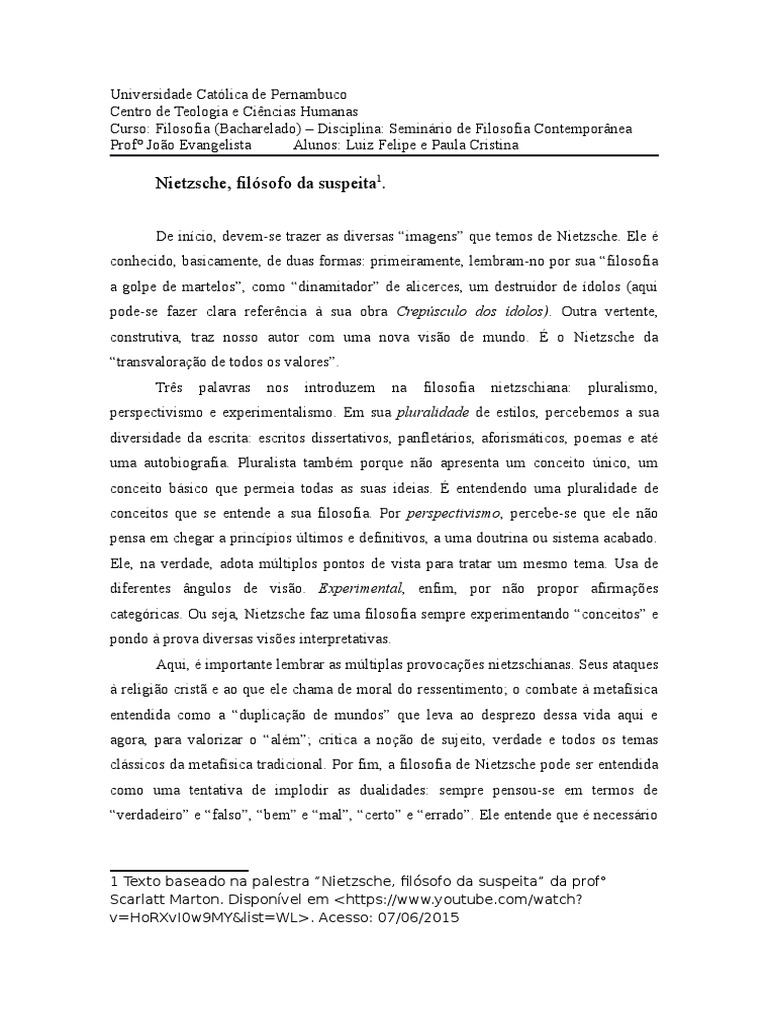 1 Texto baseado na palestra Nietzsche, filsofo da suspeita da prof
