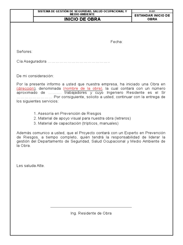 Por la presente informo a usted que nuestra empresa, ha iniciado una Obra en