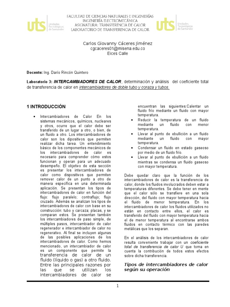 Laboratorio 3: INTERCAMBIADORES DE CALOR, determinacin y anlisis del coeficiente total