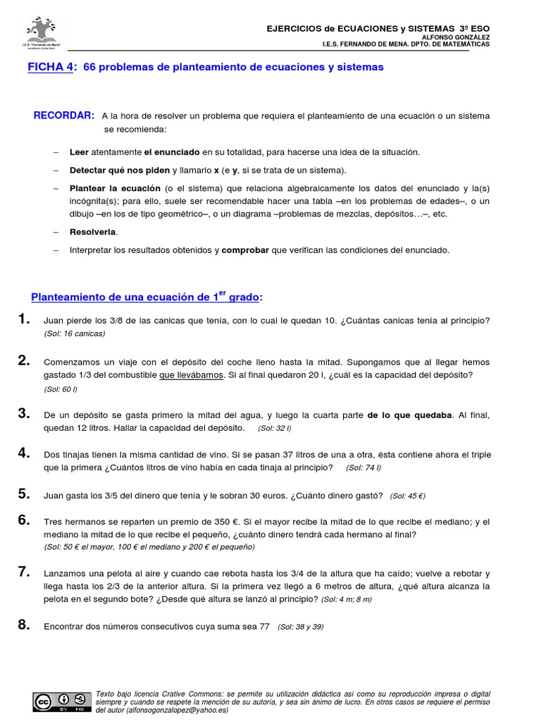 pg. 91 y ss.: 72 a 95 (planteamiento de ecuaciones de 1 o 2 grado, o de sistemas)
