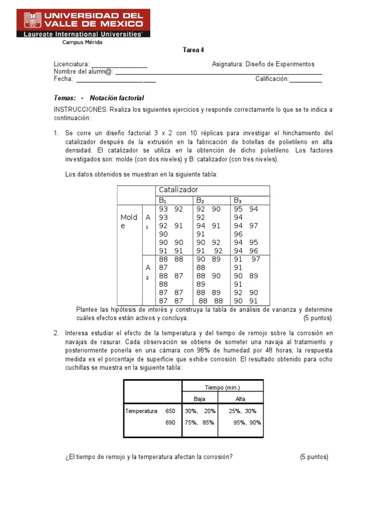 Licenciatura: ________________ Asignatura: Diseo de Experimentos