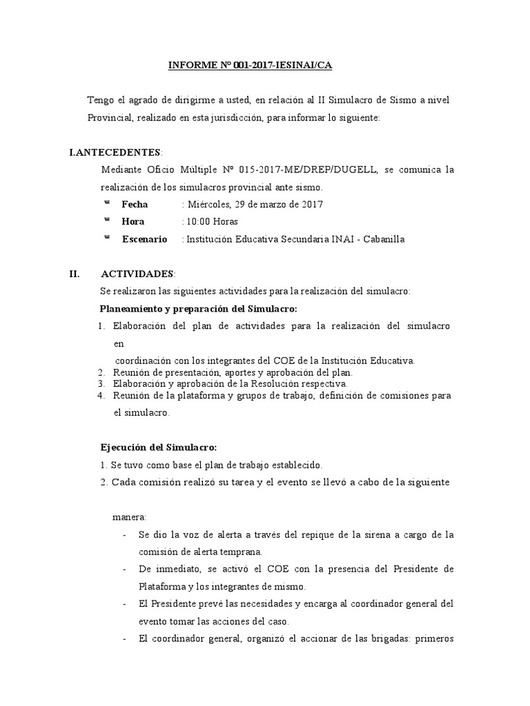 Tengo el agrado de dirigirme a usted, en relacin al II Simulacro de Sismo a nivel