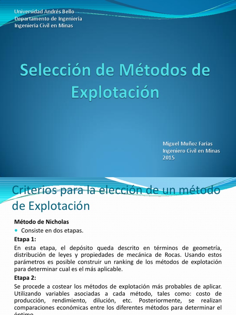 seleccin del mtodo ptimo de explotacin; Donde a cada parmetro se le