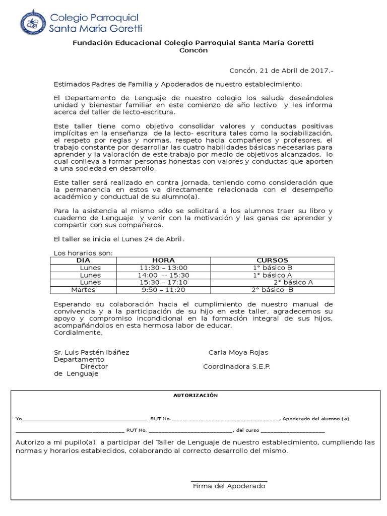 Autorizo a mi pupilo(a) a participar del Taller de Lenguaje de nuestro establecimiento, cumpliendo las