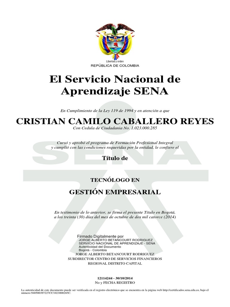 En testimonio de lo anterior, se firma el presente Titulo en Bogot,