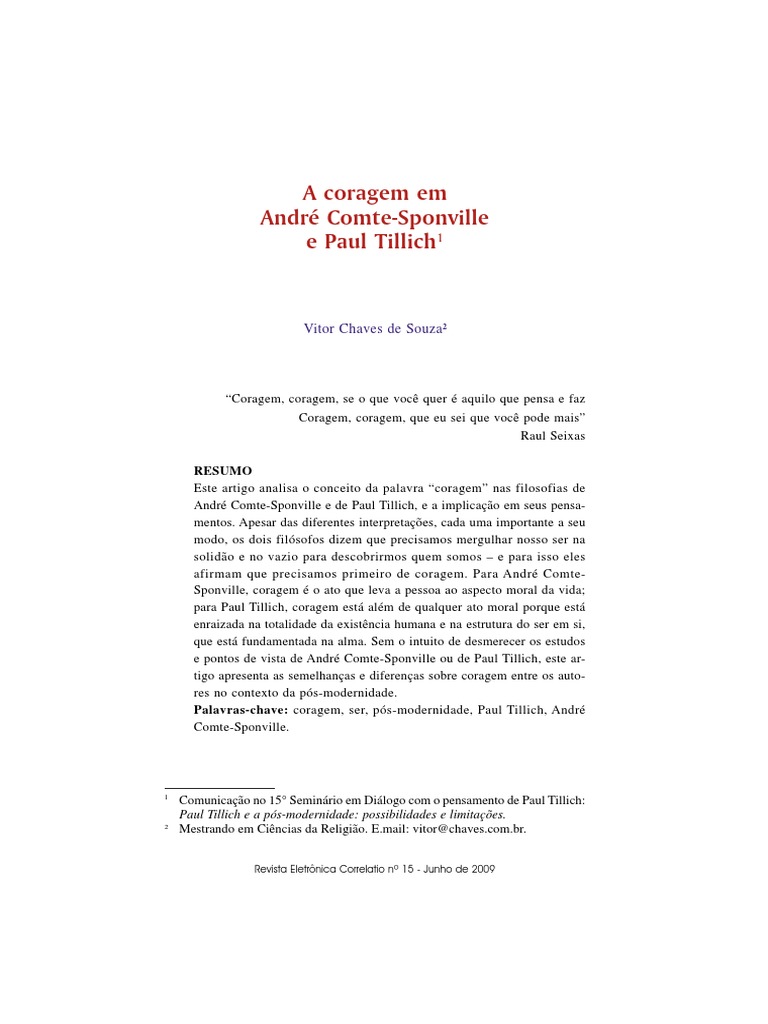 Palavras-chave: coragem, ser, ps-modernidade, Paul Tillich, Andr