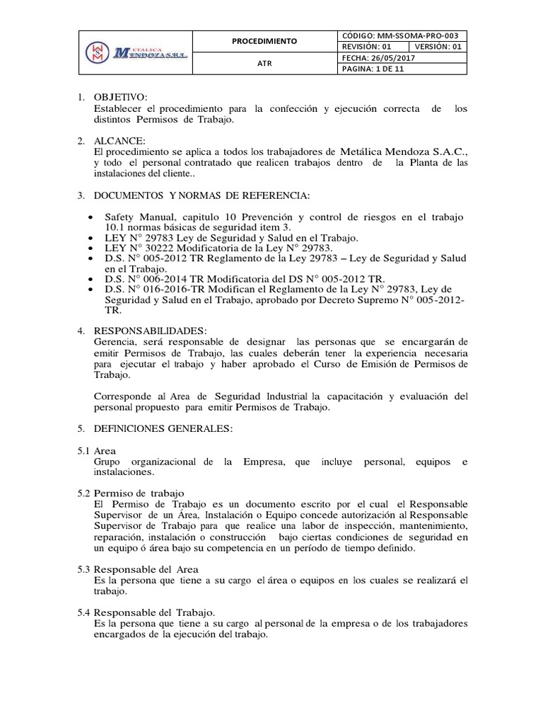 El procedimiento se aplica a todos los trabajadores de Metlica Mendoza S.A.C.,