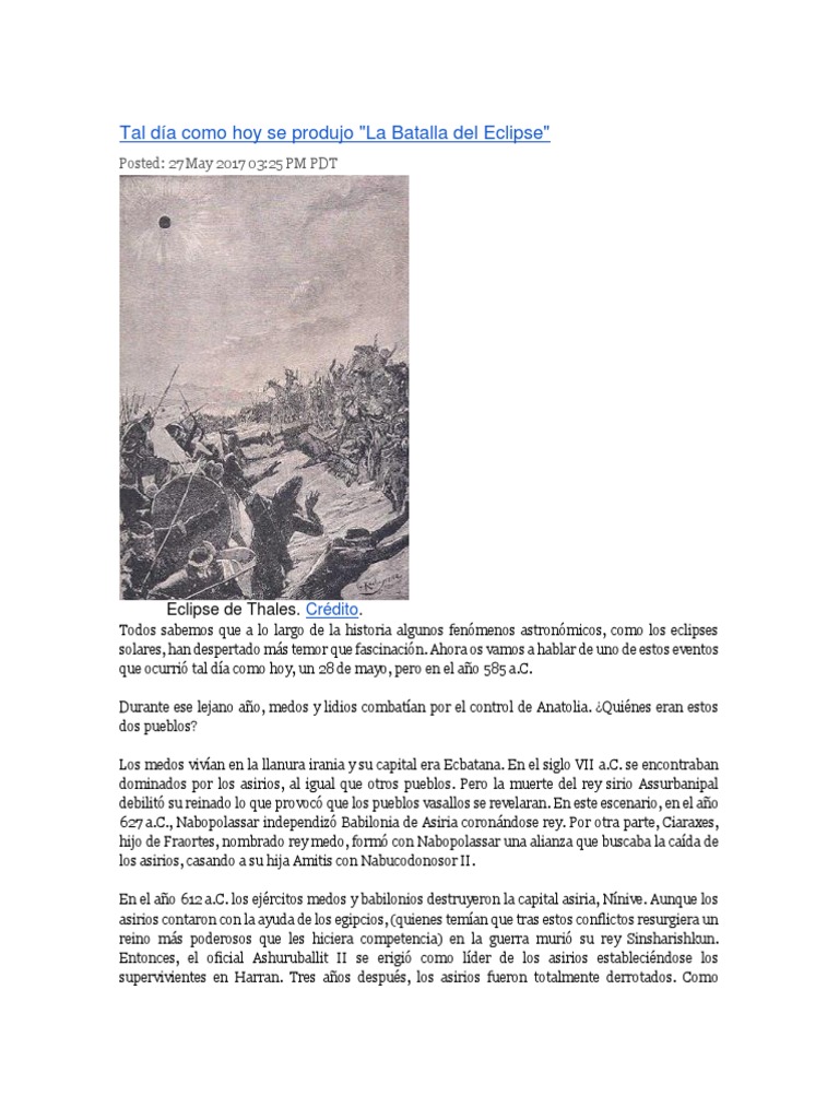 la famosa "Batalla del eclipse". Medos y lidios se enfrentaban en batalla cuando a plena luz del da