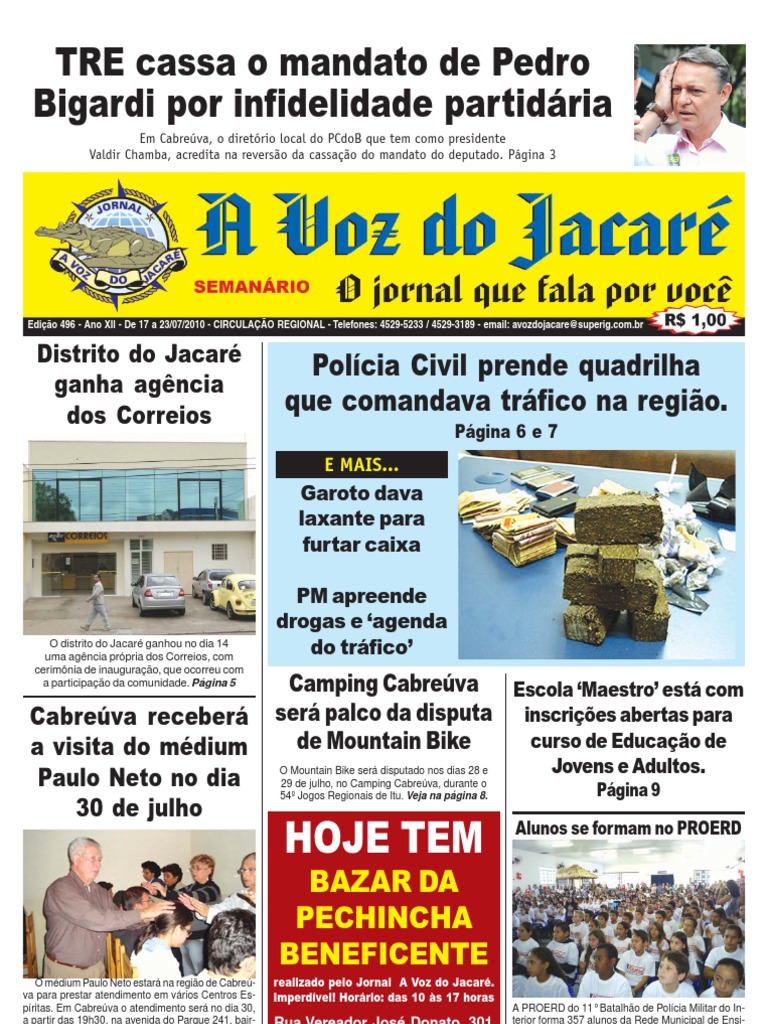 Edição 496 - Ano XII - De 17 a 23/07/2010 - CIRCULAÇÃO REGIONAL - Telefones: 4529-5233 / 4529-3189 - email: avozdojacare@superig.com.br