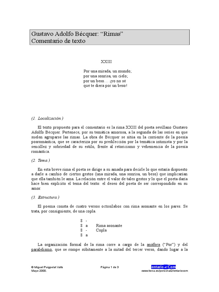 El texto propuesto para el comentario es la rima XXIII del poeta sevillano Gustavo