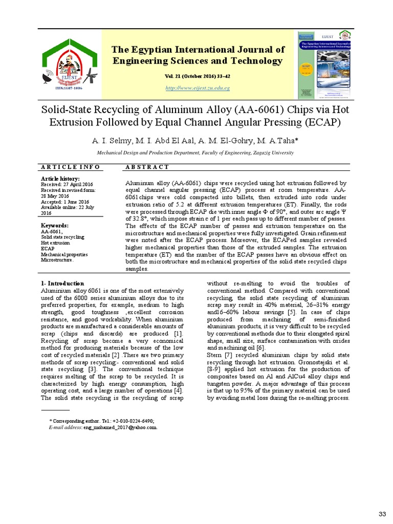 ” Journal of Alloys and Compounds. I. Haase and A. J. Ivanov. “Model for the extruded aluminum chips. 2467-2475. Z. 1891. Shin. Baudelet and A. Nazarov and B. vol. “Hall–Petch relation and boundary no. Nazarov. Chang.” Acta metallurgica et materialia. Valiev. 172. / Solid-state recycling of aluminum alloy (AA-6061) chips via hot extrusion followed by equal channel angular pressing (ECAP) [38] M. Acta metallurgica et materialia. pp. Kozlov. 217. Łojkowski. A. 23-29. Y. no. materials. Y. no. 1. S. pp. no. 1993. E. vol. Tekkaya. E. [39] N. 8. vol. “Deformation behaviour of ultra- [40] W. 216-220. V. pp. 354. pp. Selmy et al. 7. dislocations and its effect on grain boundary properties. H. Lee. 42 .” 42. B. A. 356-367. no.A. [42] R. [43] S. Baudelet. strengthening. “On the spreading of grain boundary fine-grained copper. vol.” Materials Science and Engineering: A. 2015. of ECAP on microstructure and mechanical properties of a commercial 6061 Al alloy produced by powder metallurgy. 2003. 1994. Choi and D. 1991. “Cold extrusion of hot [41] J. Lian. 51. (2004. A. pp. pp.” Journal of Materials prediction of the mechanical behaviour of nanocrystalline Processing Technology. F. “Effect 1899.” Scripta Materialia. S. Lian. vol. 806. 8. H. Hansen. 39. 1. vol. K. 801.