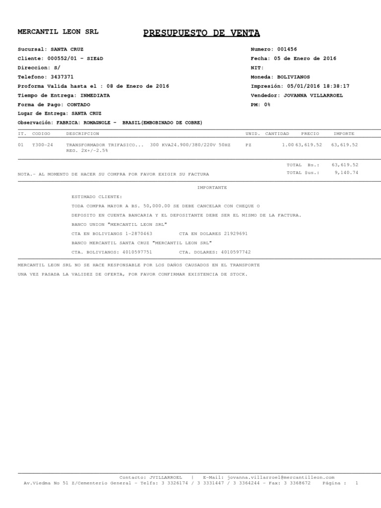 MERCANTIL LEON SRL PRESUPUESTO DE VENTA