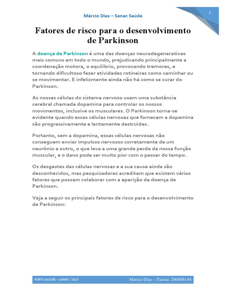 Veja a seguir os principais fatores de risco para o desenvolvimento de Parkinson: