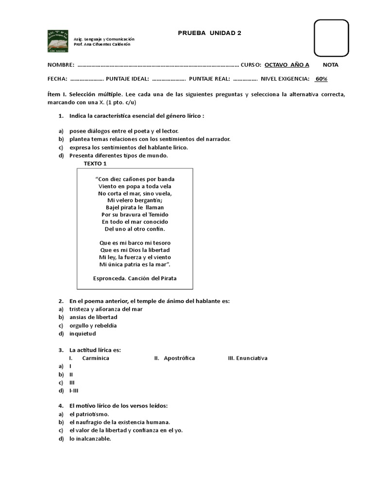 FECHA: . PUNTAJE IDEAL: . PUNTAJE REAL: . NIVEL EXIGENCIA: 60%
