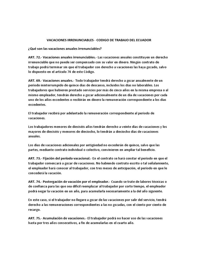 VACACIONES IRRENUNCIABLES - CODIGO DE TRABAJO DEL ECUADOR