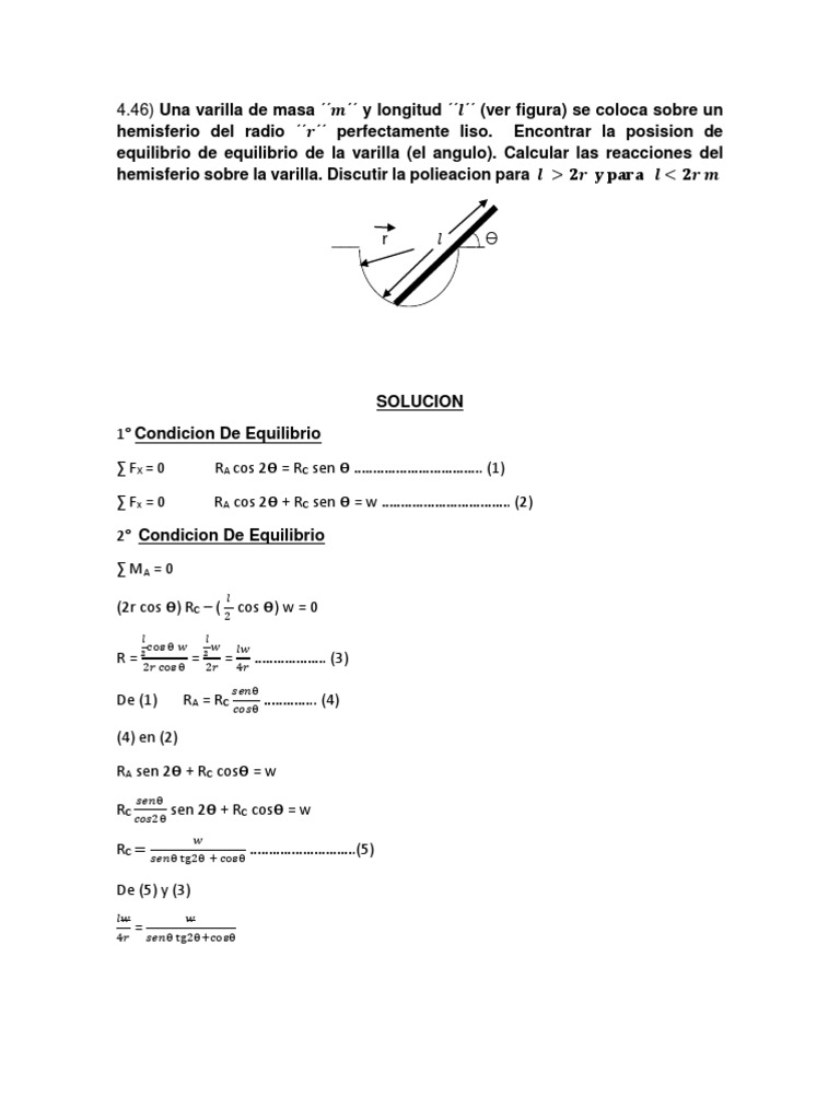 4.46). Una varilla de masa m y longitud (ver figura). Se coloca sobre un hemisferio de