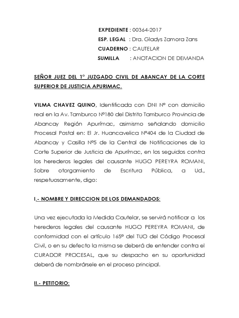 del Cdigo Procesal Civil, solicito al Juzgado MEDIDA CAUTELAR
