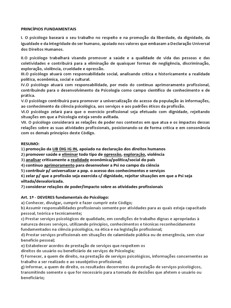 Art. 1 - DEVERES fundamentais do Psiclogo: