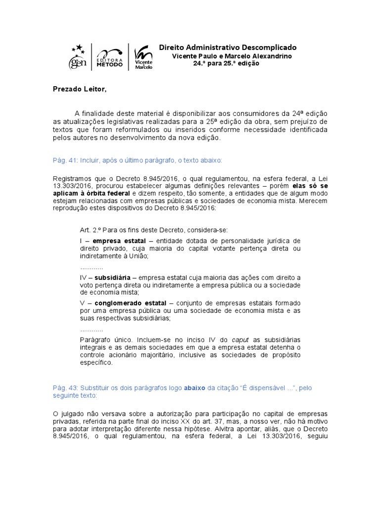 A finalidade deste material é disponibilizar aos consumidores da 24ª edição as atualizações legislativas realizadas para a 25ª edição da obra, sem prejuízo de textos que foram reformulados ou inseridos conforme necessidade identificada pelos autores no desenvolvimento da nova edição.