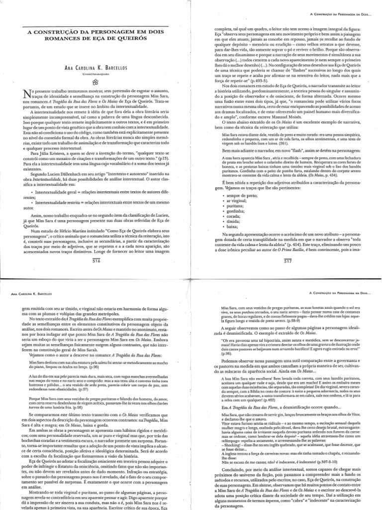 No presente trabalho tentaremos mostrar, sem pretensão de esgotar o assunto, traços de identidade e semelhança na construção da personagem Miss Sara, nos romances A Tragédia da Rua das Flores e Os Maias de Eça de Queirós.