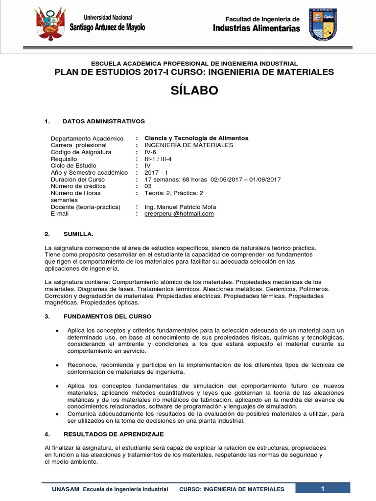PLAN DE ESTUDIOS 2017-I CURSO: INGENIERIA DE MATERIALES