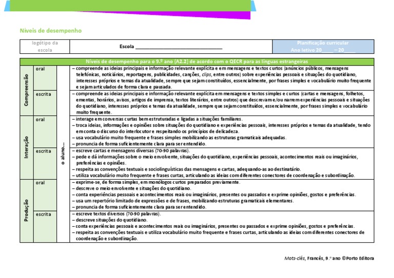 Nveis de desempenho para o 9. ano (A2.2) de acordo com o QECR para as lnguas estrangeiras