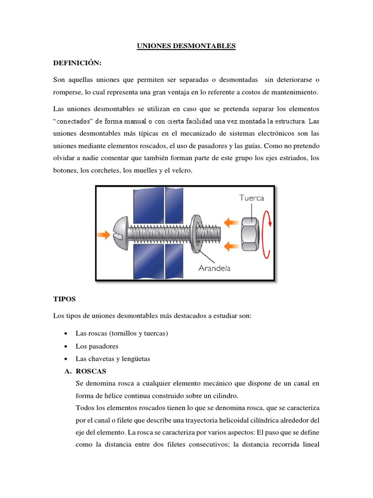 Los tipos de uniones desmontables ms destacados a estudiar son: