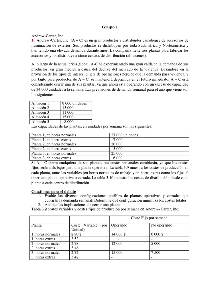 Tabla 3.9 costes variables y costes fijos de produccin por semana en Andrew- Carter, Inc.