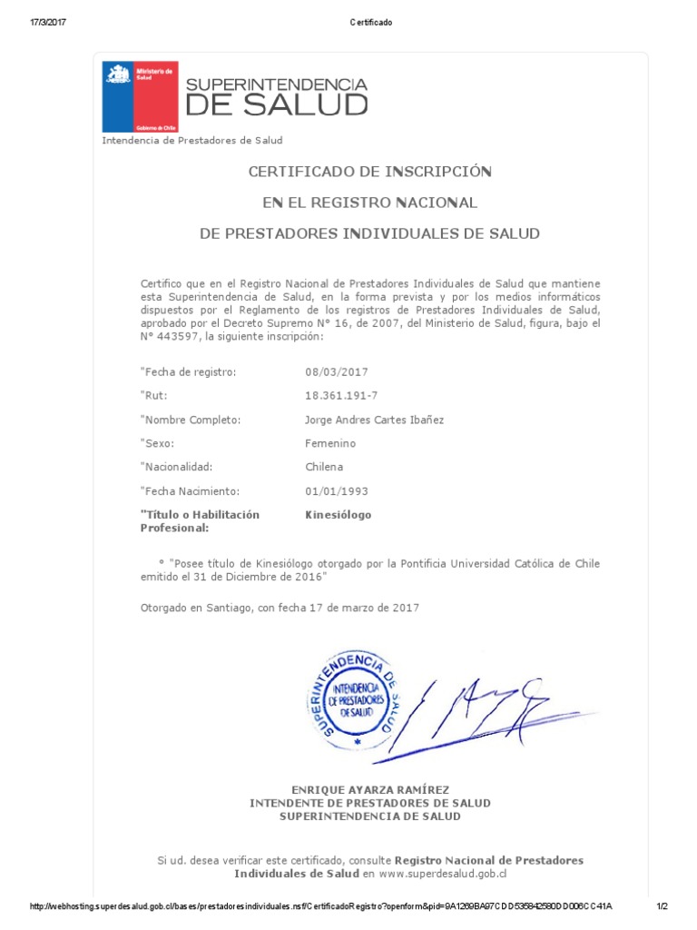 "Posee ttulo de Kinesilogo otorgado por la Pontificia Universidad Catlica de Chile