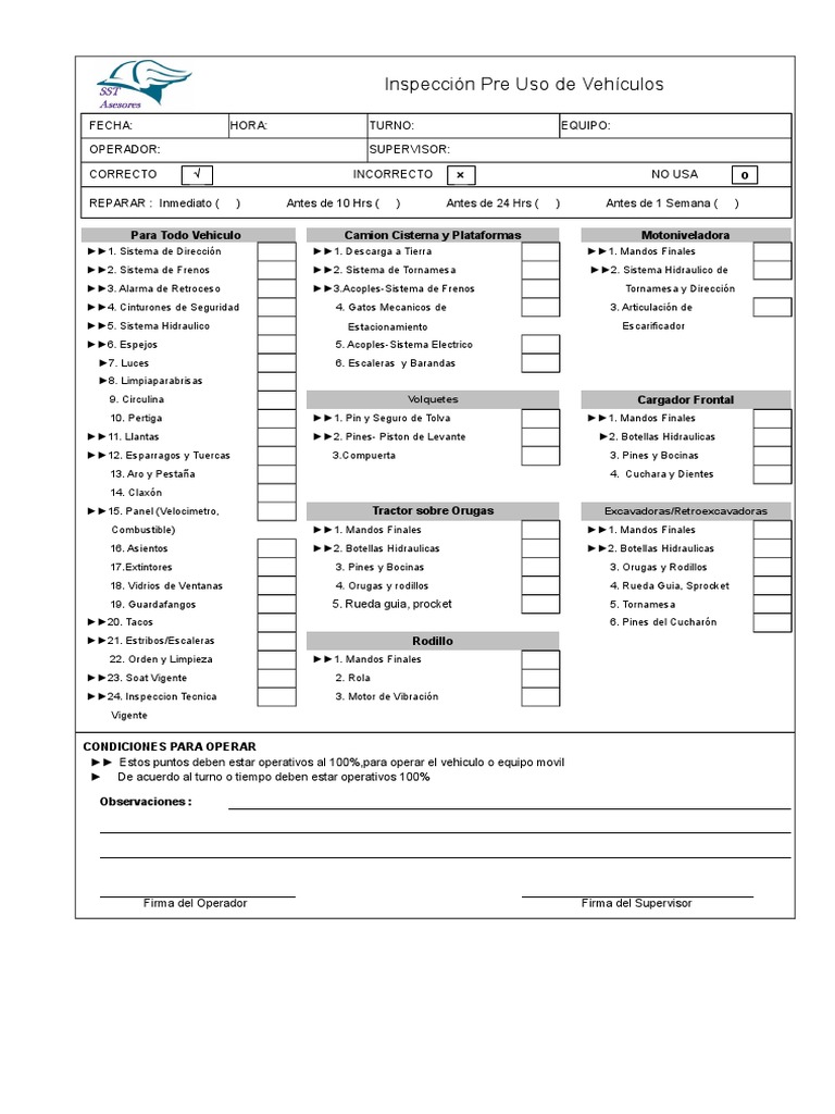 Estos puntos deben estar operativos al 100%,para operar el vehiculo o equipo movil