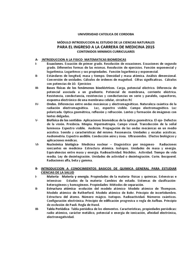 PARA EL INGRESO A LA CARRERA DE MEDICINA 2015