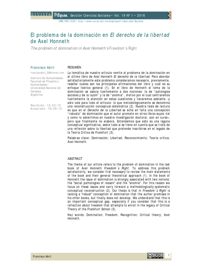 1. Abril, Francisco. Dominacin y reificacin en la teora crtica de Axel Honneth. Dalle, Pablo y