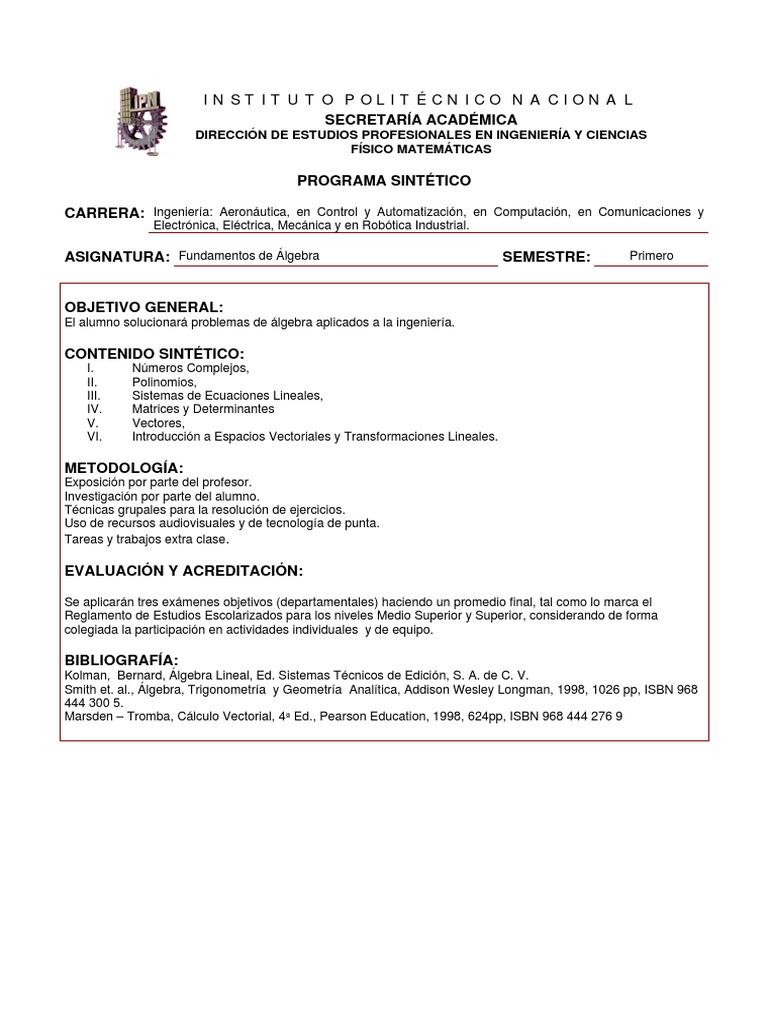 ESCUELA: Superior de Ingeniera Mecnica y Elctrica ASIGNATURA: Fundamentos de lgebra