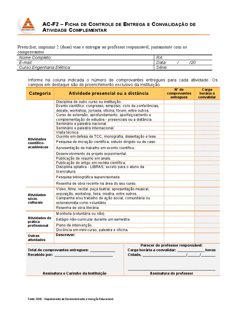 Total de comprovantes entregues: ____________ Carga horria a convalidar: _____________ horas