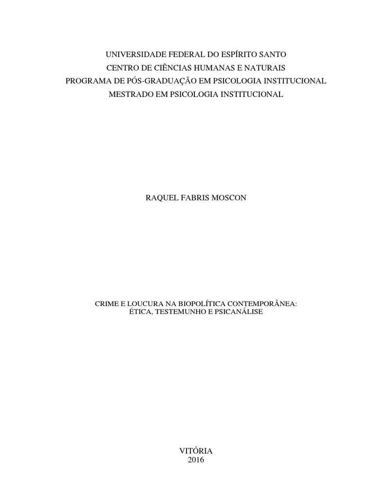 Dr. Renata Costa-Moura (Orientadora) Programa de Pós-Graduação em Psicologia Insitucional – PPGPSI/UFES Universidade Federal do Espírito Santo – UFES ________________________________________________________________________ Profa. BANCA EXAMINADORA ________________________________________________________________________ Profa. Dra. Raquel Fabris. Dissertação aprovada em ____ de ___________ de 2016. Crime e loucura na biopolítica contemporânea: ética. Acácio Augusto Sebastião Júnior (Membro titular externo) Programa de Pós-Graduação em Sociologia Política Universidade de Vila Velha – UVV ________________________________________________________________________ Prof. testemunho e psicanálise. Dr. Wilberth Claython Ferreira Salgueiro (Membro suplente) Programa de Pós-Graduação em Letras – PPGL/UFES Universidade Federal do Espírito Santo – UFES . Luciana Vieira Caliman (Membro titular interno) Programa de Pós-Graduação em Psicologia Insitucional – PPGPSI/UFES Universidade Federal do Espírito Santo – UFES ________________________________________________________________________ Prof. Dra.DEFESA DE DISSERTAÇÃO MOSCON.