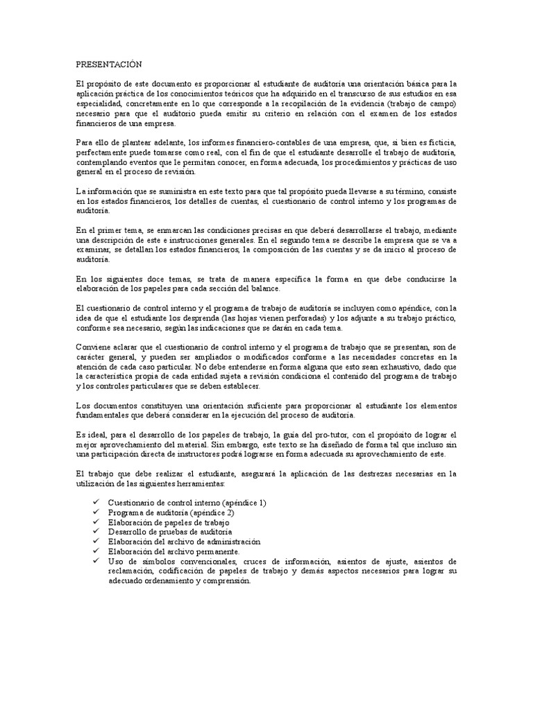 El propsito de este documento es proporcionar al estudiante de auditora una orientacin bsica para la
