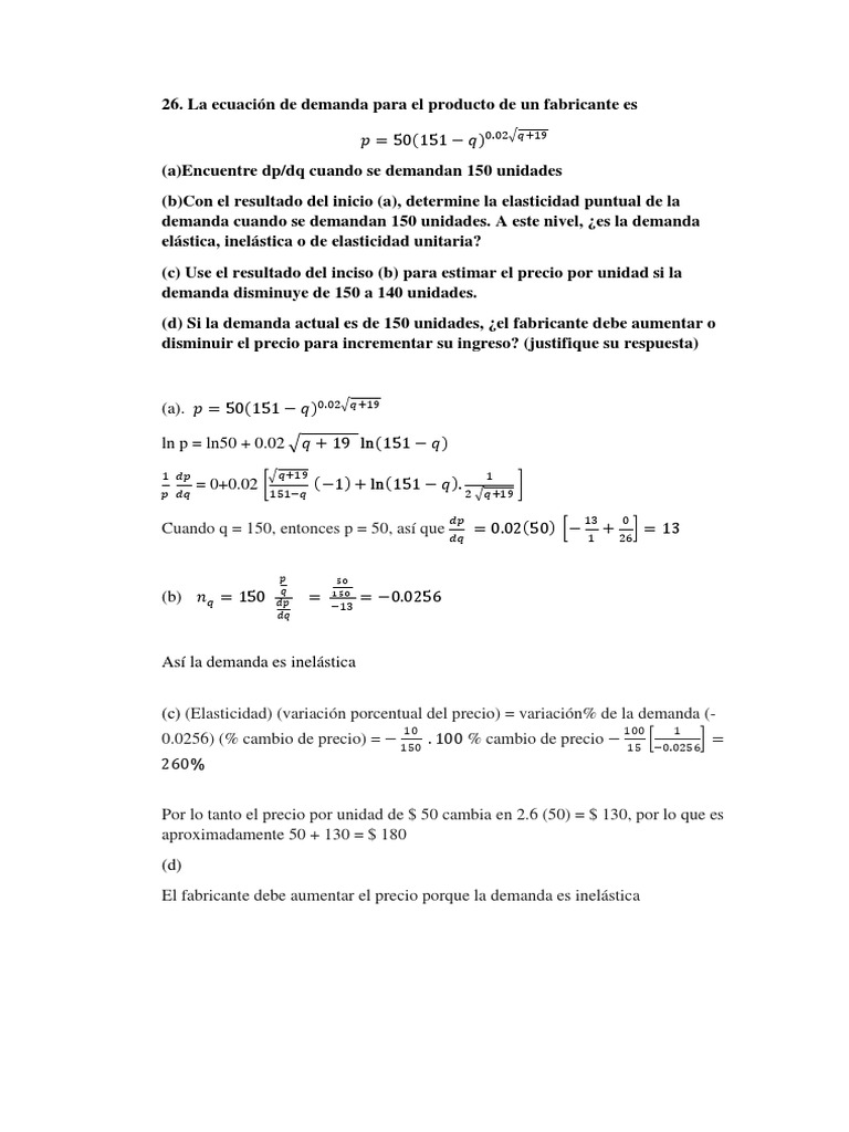 Cuando q = 150, entonces p = 50, as que = 0.02(50) [ + 26] = 13