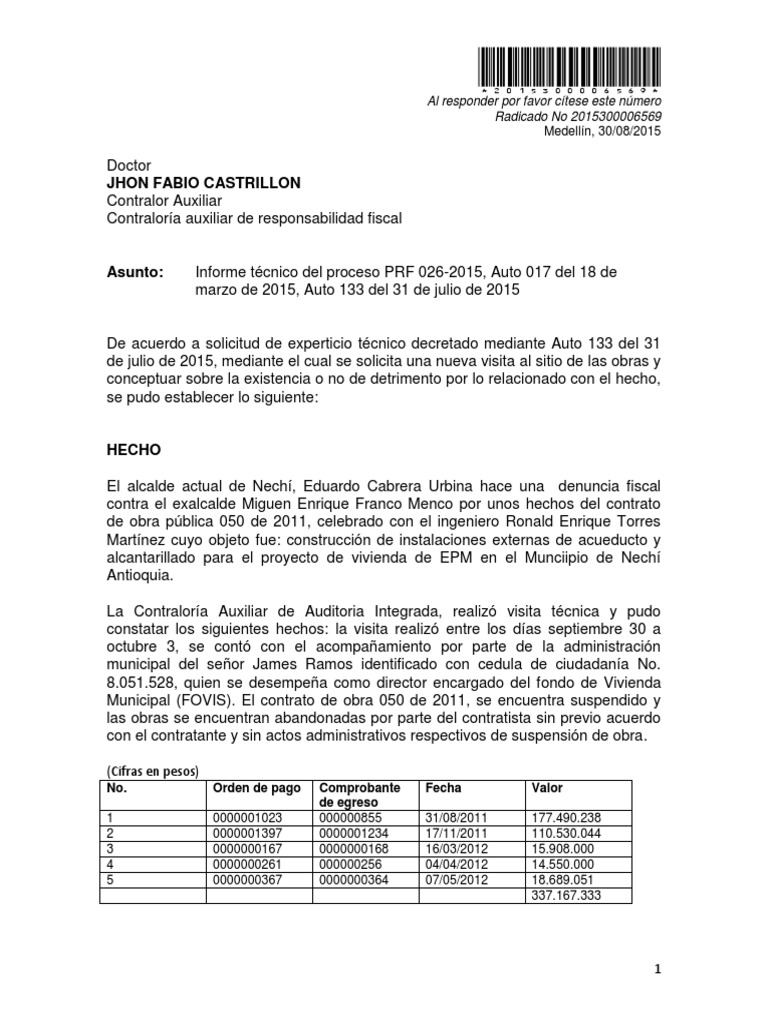 Asunto: Informe tcnico del proceso PRF 026-2015, Auto 017 del 18 de