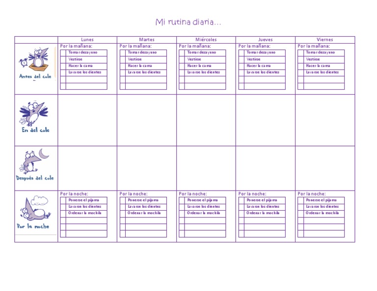 El documento describe la rutina diaria de alguien durante la semana. Cada día de la mañana sigue los mismos pasos: tomar desayuno, vestirse, hacer la cama y lavarse los dientes. Por la noche, la rutina también es similar cada día e incluye ponerse el pijama, lavarse los dientes y ordenar la mochila.